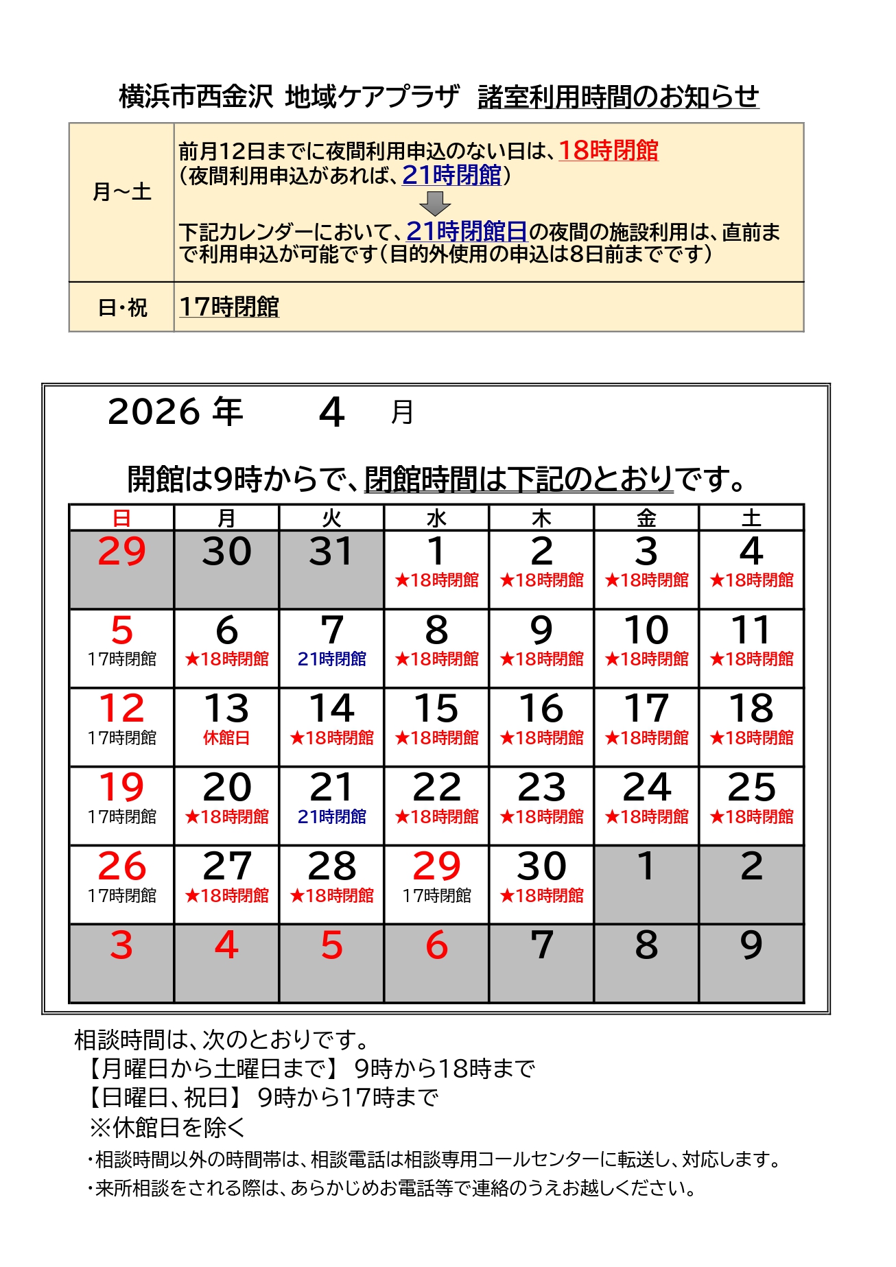・「4月の横浜市西金沢地域ケアプラザの諸室利用時間カレンダー」