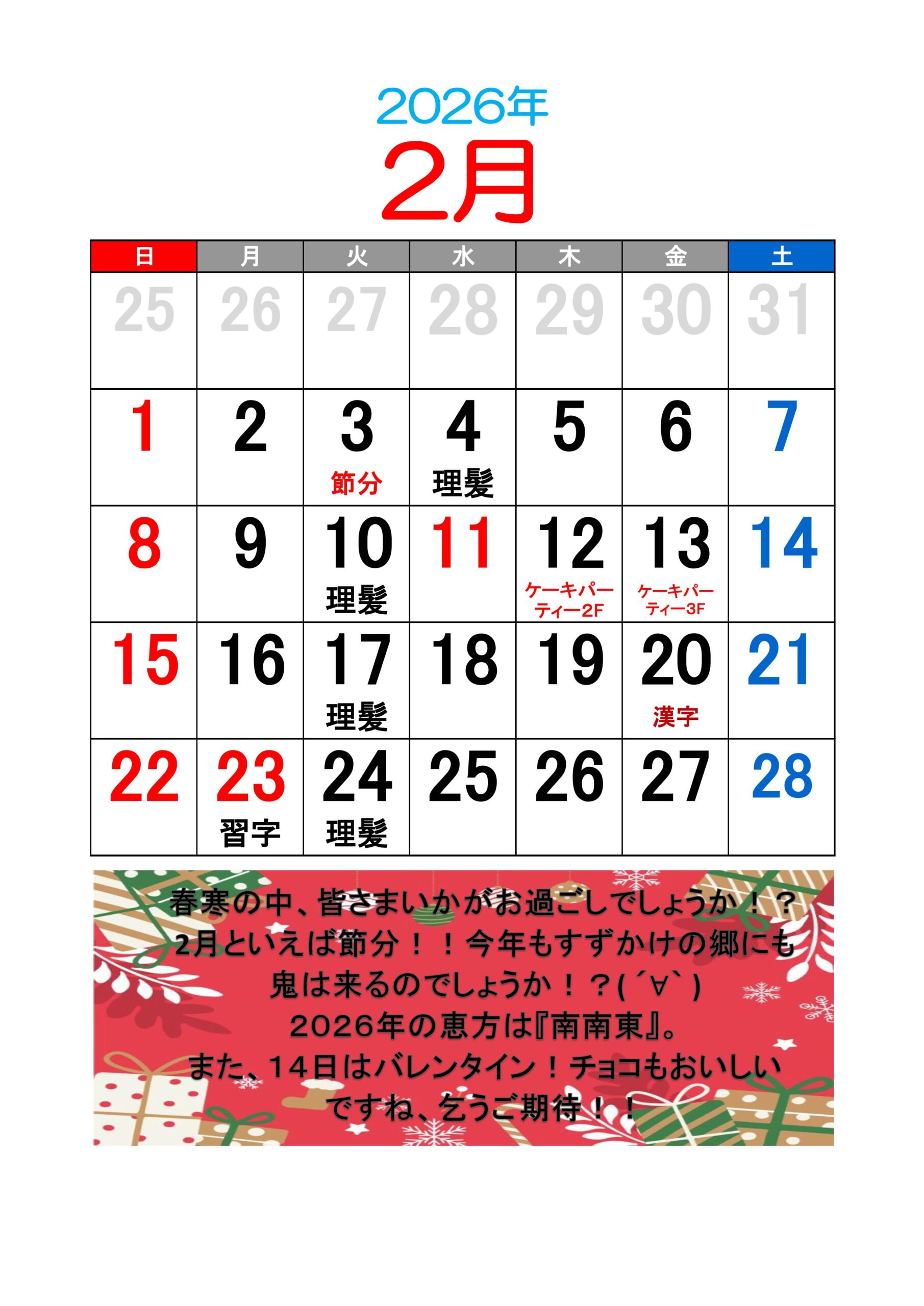 【行事】 ・2月 3日(火) 節分 ・2月19日(木) 誕生日会