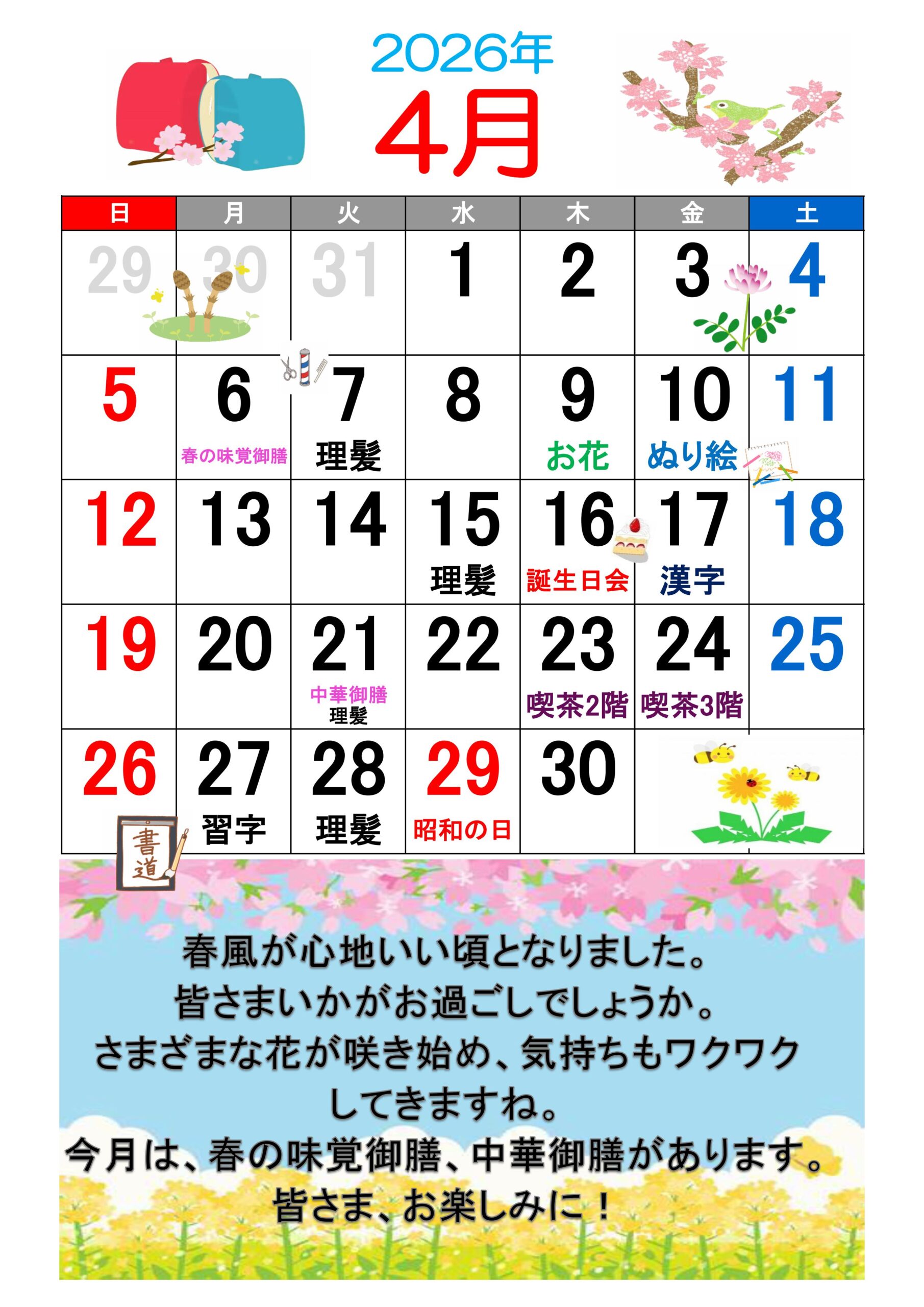 【行事】 ・4月 7日(火) すずかけレストラン(3F) ・4月13日(月) 出前クラブ(3F) ・4月14日(火) やわらかレストラン(2F) ・4月16日(木) 誕生日会 ・4月17日(金) 出前クラブ(2F)