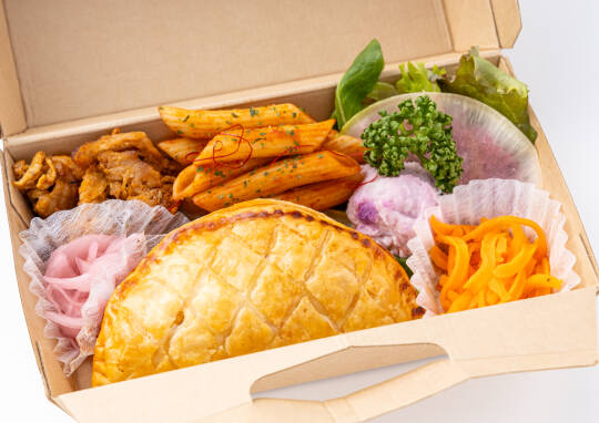 軽食は、ミートパイまたはフルーツサンドからお選びいただき、お渡ししました。